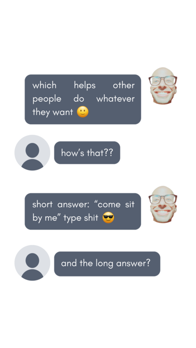 “One thing I love about you: you'll listen to anything that I throw up at you. It's not even a skill, it’s who you are. You're just listening to whatever needs to come out of my mouth. Whether that be excitement or grief or just a ramble. I just need to talk at somebody. It’s a space you create where I get to be myself.”